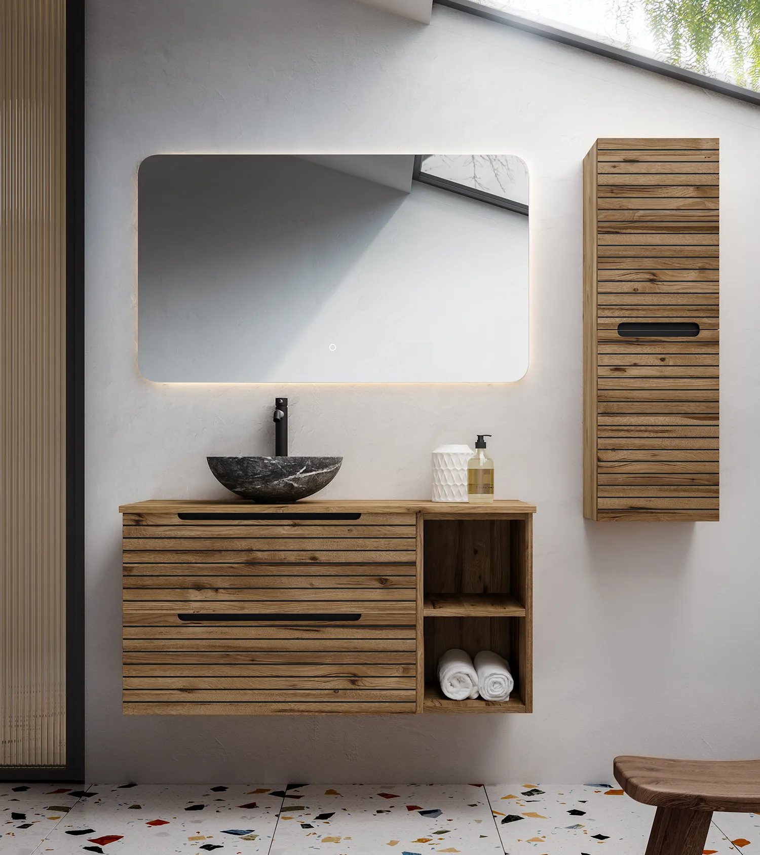 This piece of furniture stands out for its exquisite wooden details, which bring a sense of naturalness and warmth to any space. With clean lines and high-quality finishes, Ruanda not only optimizes storage but also adds a touch of distinction to your bathroom.